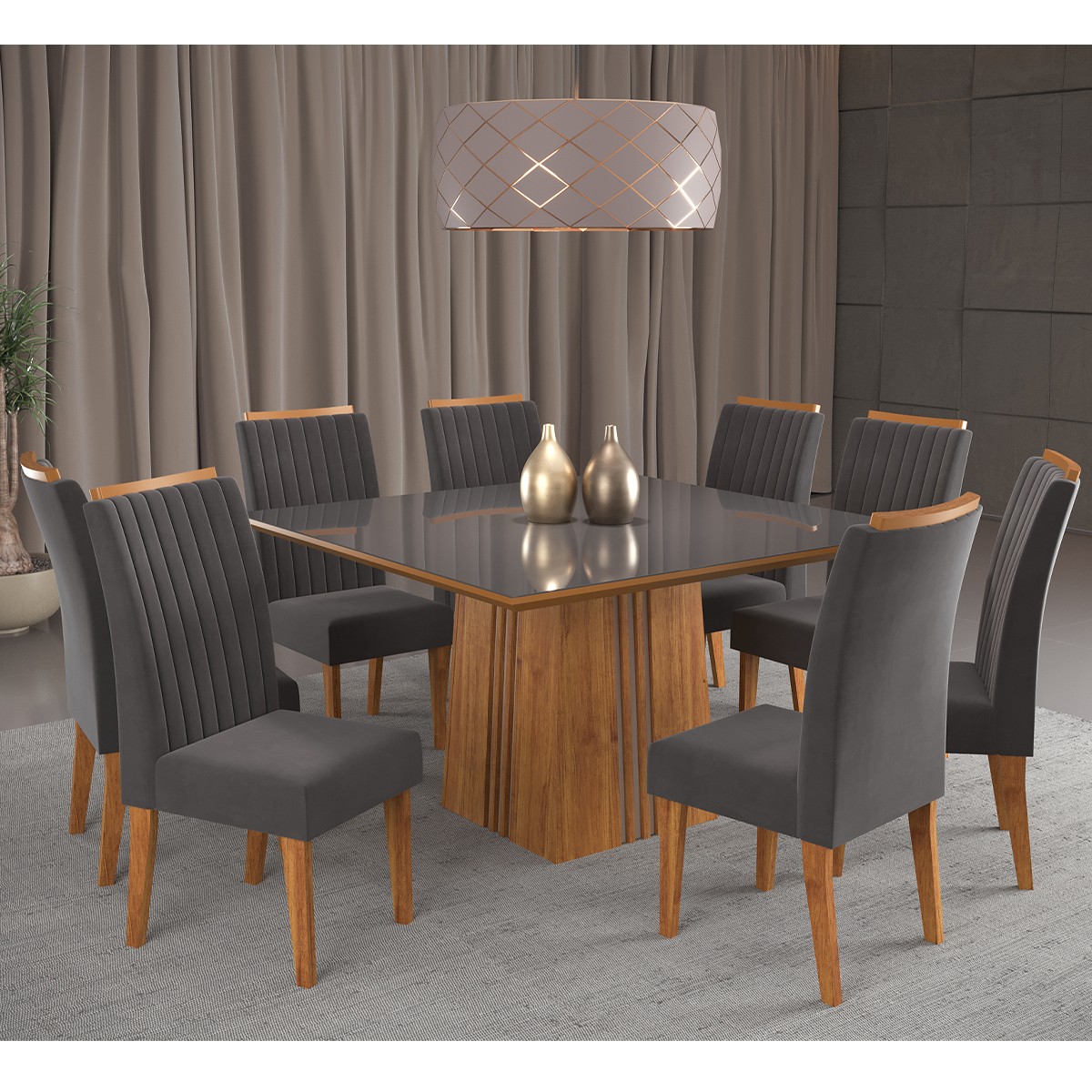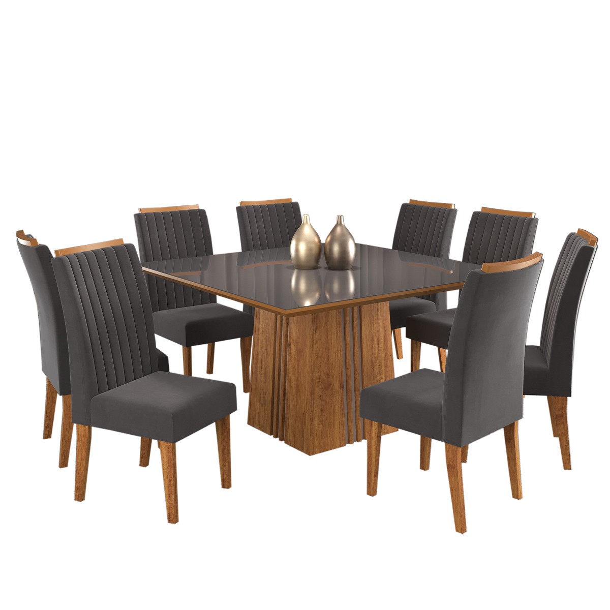 A sala de jantar apresenta uma mesa quadrada com tampo em MDF de 40mm e vidro, proporcionando um design moderno e sofisticado que combina a resistência do MDF com a transparência elegante do vidro. O conjunto é complementado por 8 cadeiras modelo Fran, feitas em MDP/MDF, que oferecem uma base sólida e estabilidade, além de um acabamento contemporâneo e minimalista. As cadeiras são revestidas com espuma D26, garantindo um conforto superior durante as refeições. O contraste entre a robustez do MDF e a leveza do vidro cria um visual harmônico, perfeito para ambientes de diferentes estilos. Ideal para quem busca funcionalidade e elegância em um só conjunto, a mesa e as cadeiras oferecem a combinação perfeita de estética e durabilidade. A qualidade dos materiais assegura a longevidade do móvel, mantendo sua beleza e conforto por anos. Esse conjunto é a escolha ideal para quem deseja um espaço moderno, acolhedor e elegante para suas refeições. O design clean e sofisticado das peças torna o conjunto adequado para salas de jantar de diversos tamanhos e estilos.