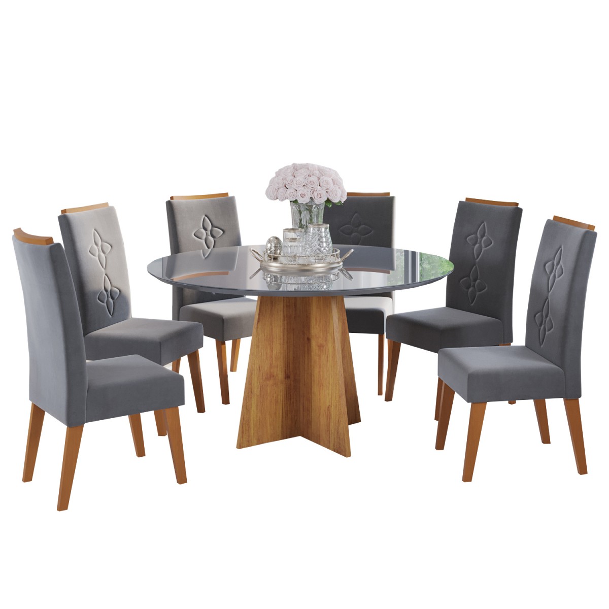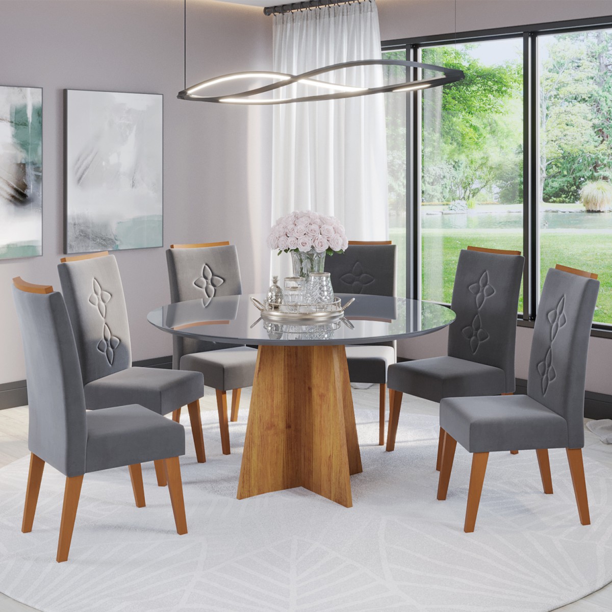 A sala de jantar com mesa redonda em MDP, tampo em MDF com vidro, é um espaço que exala elegante e aconchego. Seu design circular promove uma atmosfera intimista, ideal para conversas e momentos de descontração entre amigos e familiares. As seis cadeiras em madeira maciça, com assentos em espuma D26, garantem um conforto excepcional, permitindo que todos desfrutem de longas refeições. O tampo de vidro acrescenta um toque de sofisticação e facilita a manutenção, tornando o cotidiano mais prático. A combinação de materiais confere à mesa durabilidade e resistência, perfeita para o uso diário. Esse conjunto harmoniza beleza e funcionalidade, adaptando-se a diversos estilos de decoração. Cada detalhe foi pensado para criar um ambiente acolhedor, onde todos se sintam bem-vindos.