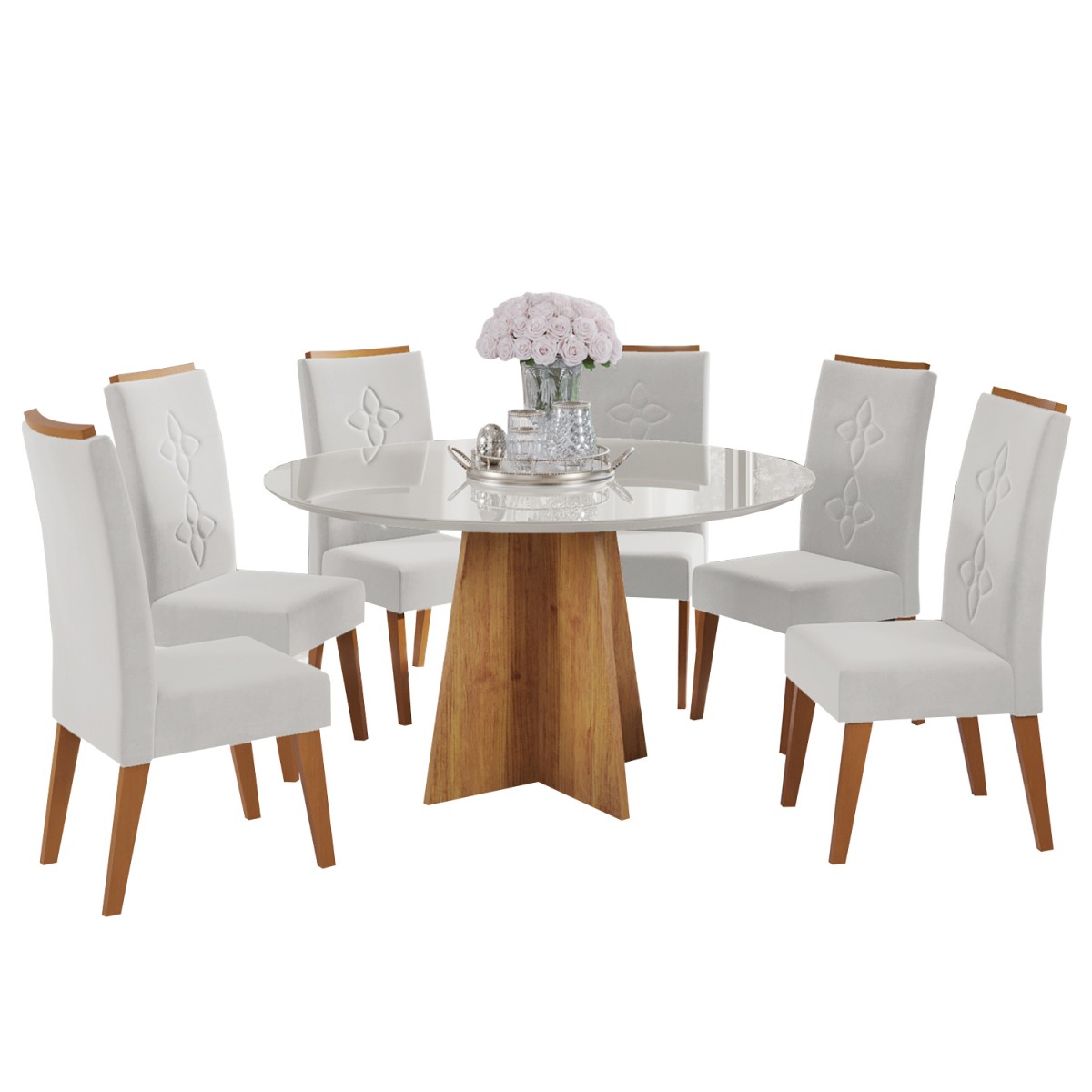 A sala de jantar com mesa redonda em MDP, tampo em MDF com vidro, é um espaço que exala elegante e aconchego. Seu design circular promove uma atmosfera intimista, ideal para conversas e momentos de descontração entre amigos e familiares. As seis cadeiras em madeira maciça, com assentos em espuma D26, garantem um conforto excepcional, permitindo que todos desfrutem de longas refeições. O tampo de vidro acrescenta um toque de sofisticação e facilita a manutenção, tornando o cotidiano mais prático. A combinação de materiais confere à mesa durabilidade e resistência, perfeita para o uso diário. Esse conjunto harmoniza beleza e funcionalidade, adaptando-se a diversos estilos de decoração. Cada detalhe foi pensado para criar um ambiente acolhedor, onde todos se sintam bem-vindos.