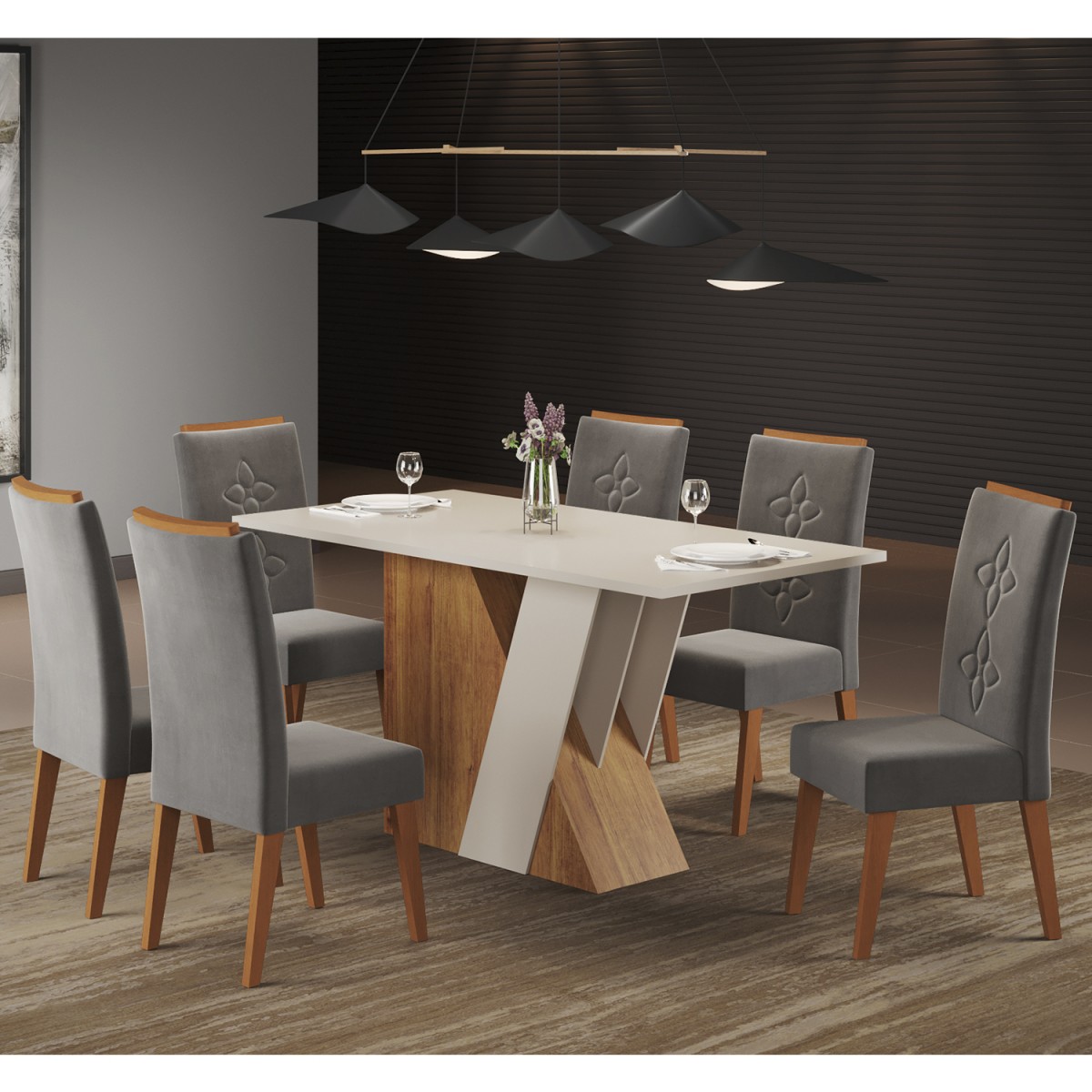 A sala de jantar é composta por uma mesa retangular com tampo em MDP de 25mm, que oferece resistência e durabilidade, sendo a base perfeita para momentos especiais e reuniões familiares. O tampo em MDP garante facilidade de manutenção, enquanto seu design robusto e elegante se adapta a diferentes estilos de decoração. A mesa é acompanhada por 6 cadeiras modelo Flora, feitas em madeira maciça, que trazem um toque rústico e sofisticado ao ambiente. As cadeiras são revestidas com espuma D26, proporcionando conforto excepcional durante as refeições, permitindo que todos desfrutem de momentos agradáveis à mesa. O conjunto é ideal para quem busca aliar funcionalidade e estilo, criando uma atmosfera acolhedora e elegante. A madeira maciça das cadeiras oferece durabilidade, conferindo um visual atemporal e de alta qualidade. A mesa retangular, com seu amplo tampo, oferece espaço suficiente para acomodar até seis pessoas com conforto. A combinação dos materiais de alta qualidade garante a longevidade do conjunto, mantendo sua beleza e resistência ao longo do tempo..