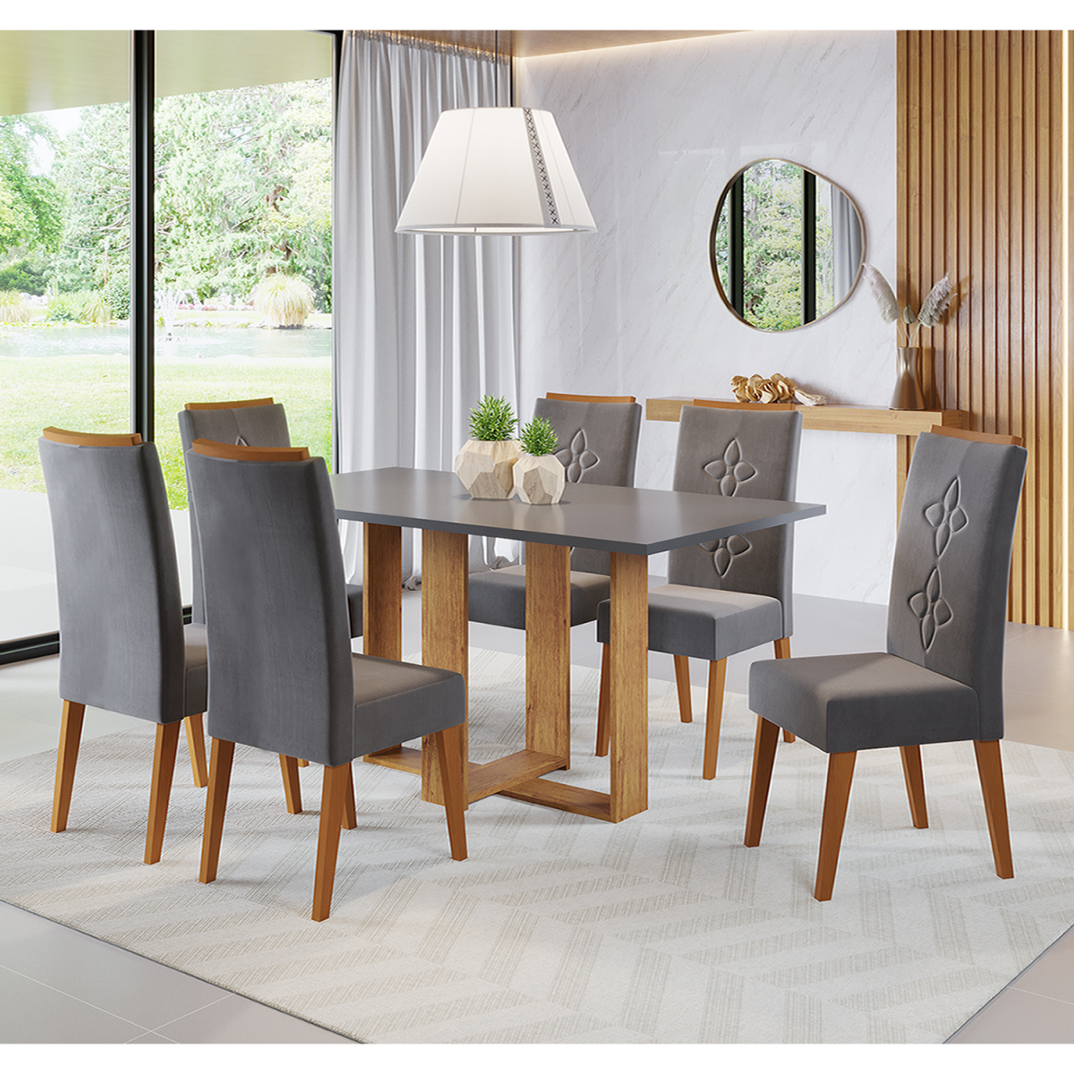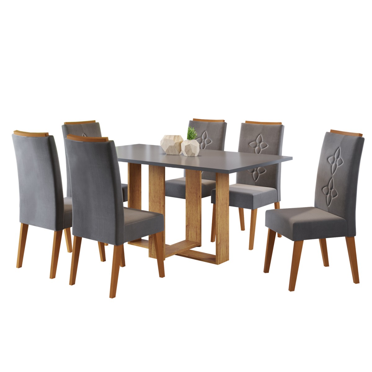 Mesa de Jantar Retangular Nevoa com 6 Cadeiras Flora em Madeira Maciça Mel/Cinza Brilho/Grafite - Casa Giulia