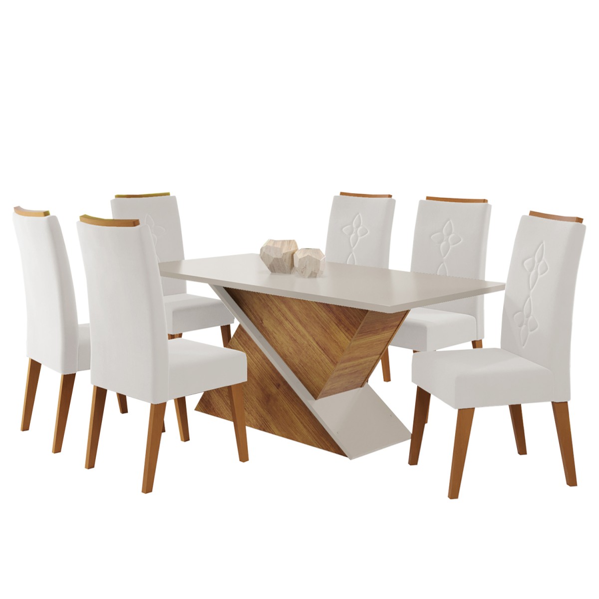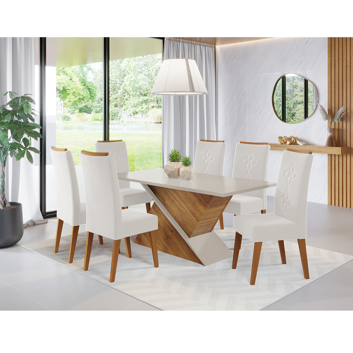 A sala de jantar apresenta uma mesa elegante com tampo em MDP de 25mm, que combina resistência e sofisticação, ideal para criar um ambiente acolhedor e moderno. O tampo em MDP oferece durabilidade, enquanto o acabamento impecável adiciona um toque de estilo contemporâneo ao espaço. A mesa é acompanhada por 6 cadeiras modelo Flora, feitas em madeira maciça, que trazem um charme natural e rústico, além de grande resistência. As cadeiras são revestidas com espuma D26, garantindo conforto excepcional durante as refeições, permitindo que você e seus convidados desfrutem de momentos agradáveis à mesa. O conjunto é perfeito para quem deseja um ambiente funcional, sem abrir mão da elegância e do conforto. A madeira maciça das cadeiras confere uma estética atemporal, enquanto o design clean da mesa complementa o ambiente de maneira harmoniosa. Ideal para jantares em família ou recepções, este conjunto oferece o equilíbrio perfeito entre estilo e praticidade. A qualidade dos materiais assegura a longevidade do móvel, mantendo sua beleza e funcionalidade por muitos anos.