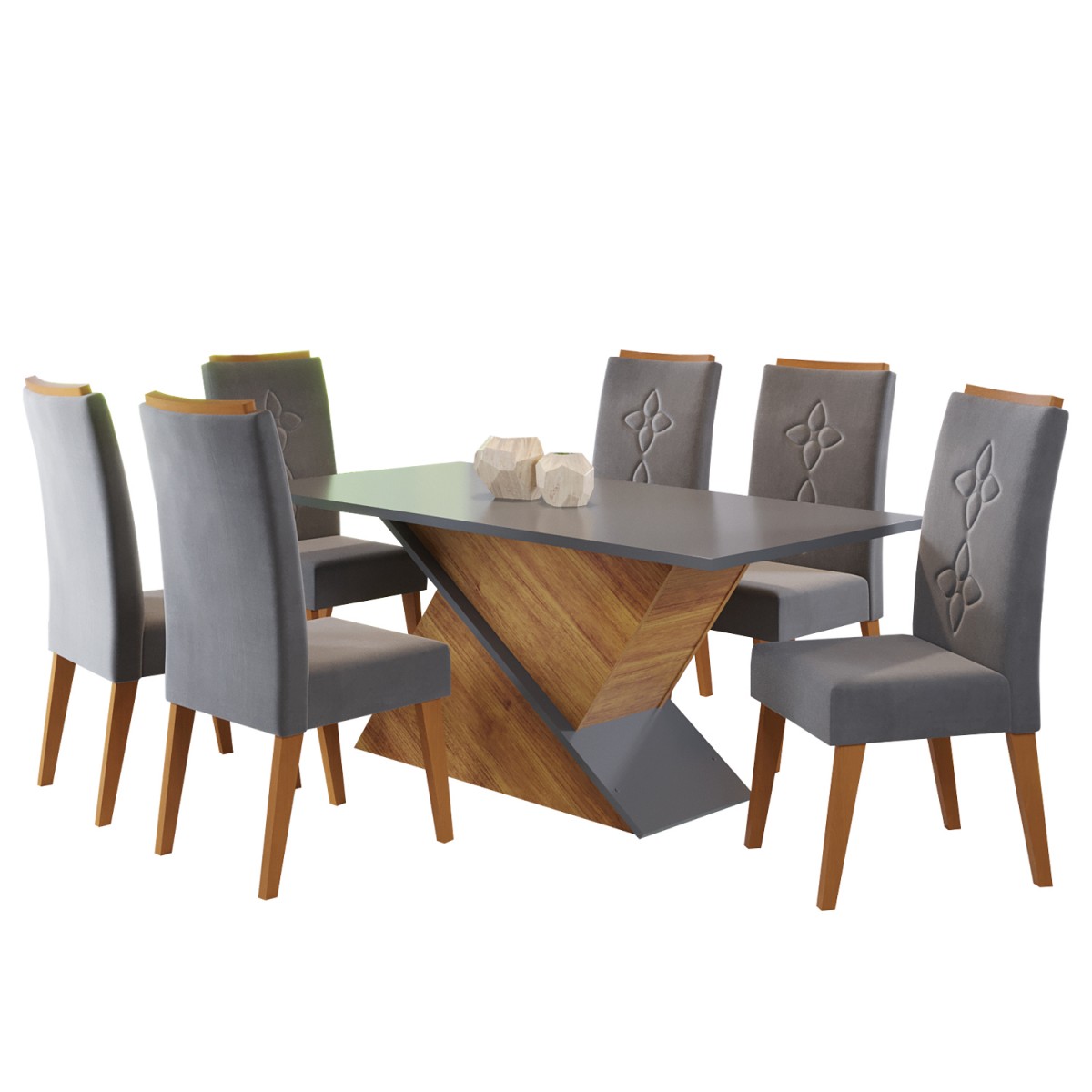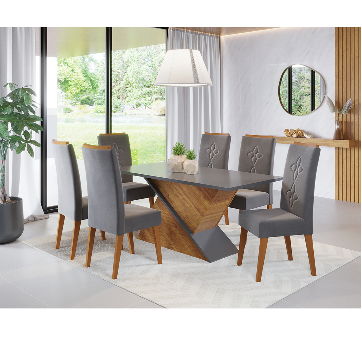 Mesa de Jantar Retangular Patagonia com 6 Cadeiras Flora em Madeira Maciça Mel/Cinza Brilho/Grafite - Casa Giulia